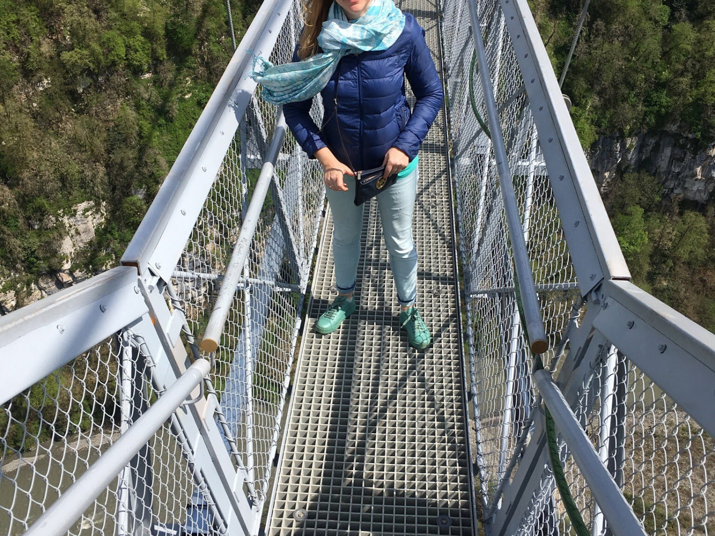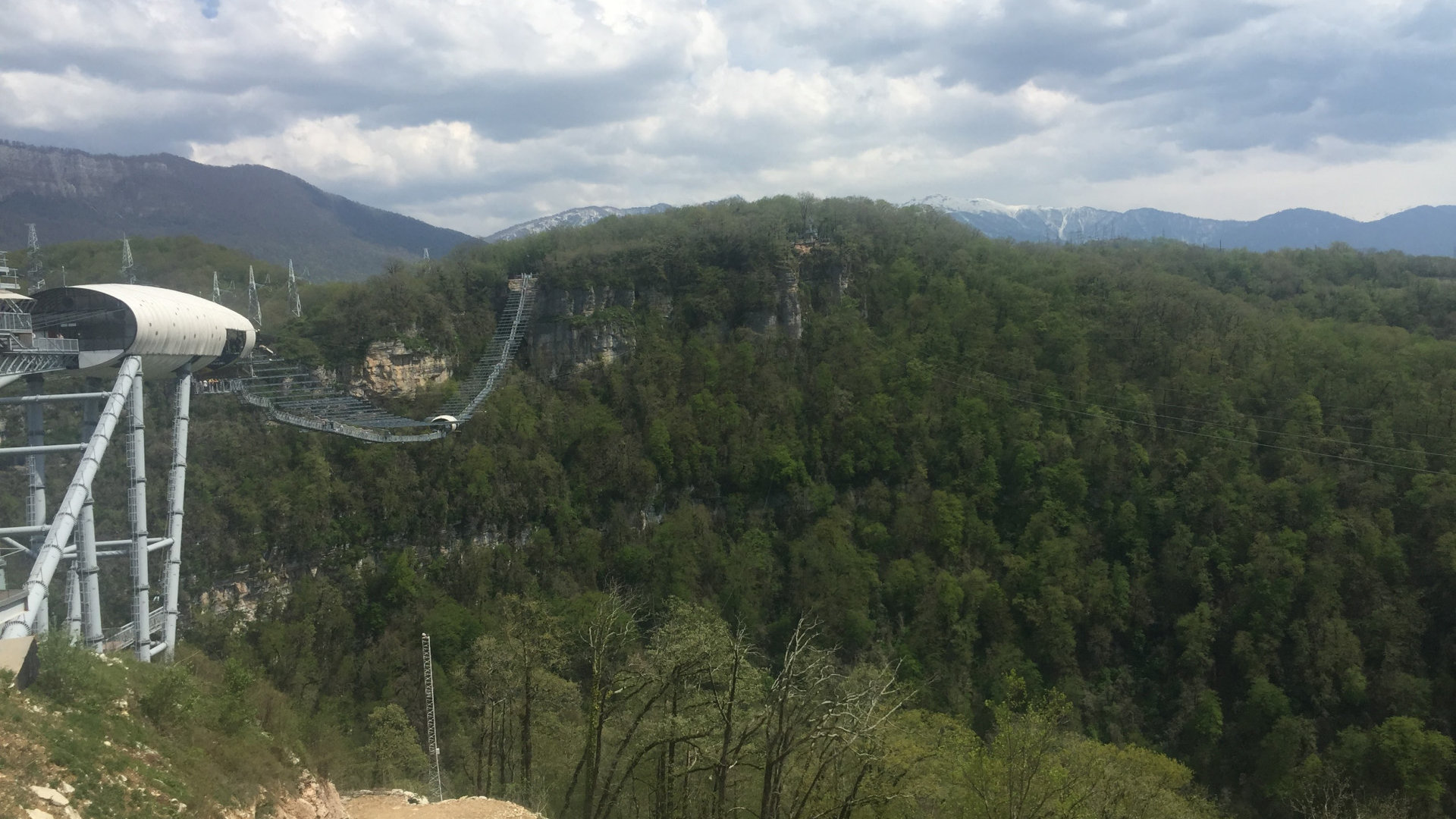 Давайте по порядку. «Гвоздем» Скайпарка является подвесной мост Скайбридж. Это один из самых длинных подвесных мостов в мире, протяженность его составляет 439 метров, высота 207. Мост выполнен из ажурной стали и по утверждению создателей с высокой степенью безопасности. Если вы не боитесь высоты, то прогулка по нему доставит вам огромное удовольствие. Если боитесь, то вам в Скайпарк не надо, там все такое. И да, я лично видела идущего на четвереньках по мосту человека. Видимо он тоже думал, что не боится. По мосту можно ходить туда сюда сколько угодно. В одну сторону у вас откроется вид на море, в другую на горы, а под вам где то очень далеко, будет Ахштырское ущелье с рекой Мзымтой на дне.