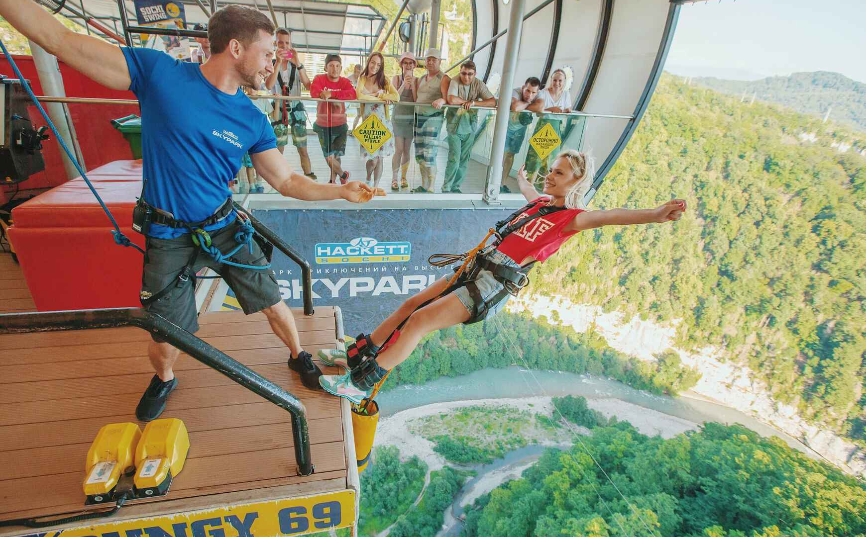 Банджи-джампинг, то есть «тарзанка». Прыгать можно всеми мыслимыми способами с разным размером веревки, к которой вы привязаны. Ест 70 метров и 200 метров. Смотреть на смельчаков можно бесплатно и безопасно.