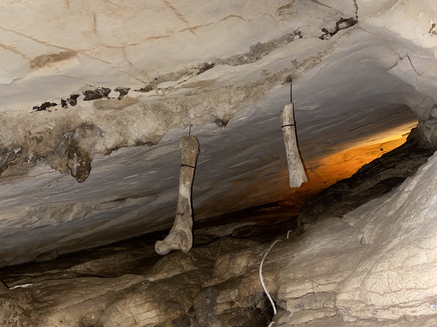 В одной из ниш висят две внушительные кости, выданные экскурсоводом за останки пещерного медведя. Ну правильно, какая пещера без пещерного медведя? Хорошо кусочек неандертальца не повесили рядом. А он ( неандерталец) тут жил много лет. Пещера всегда была обитаема и изведана. И нашими предками и медвежьими. Даже ученные тут тоже жили, пока исследования вели. Удобно, говорят, тепло, сухо и не сквозит. А медведи, по мнению экскурсовода были до 2 метров в холке. Интересно, что же такое водилось снаружи в Колхидском лесу, что двухметровый медведь был более желанным соседом?